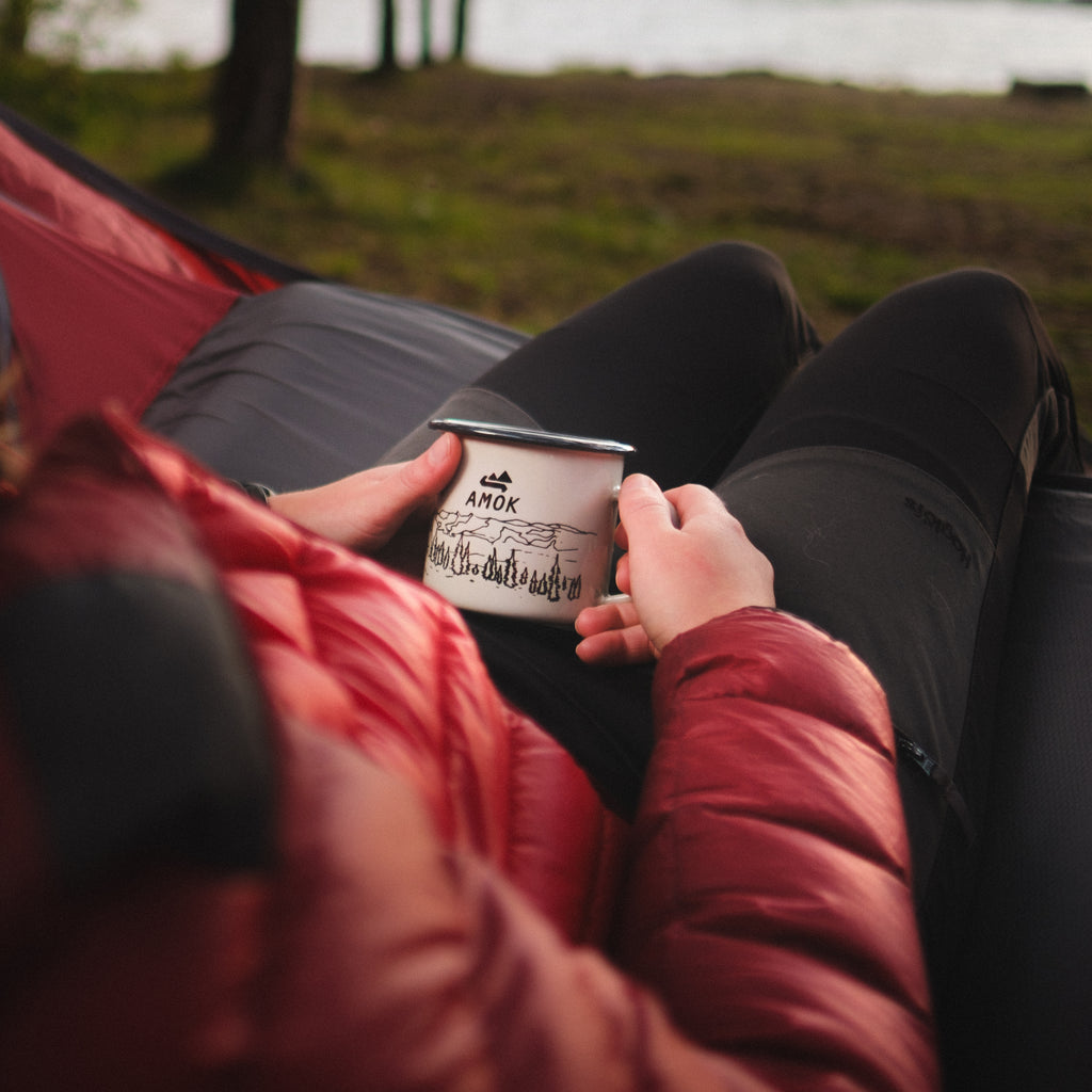 The hammock mug is made from durable enamel coated steel. Use it to calibrate your hammock and get that good 30 degree pitch.