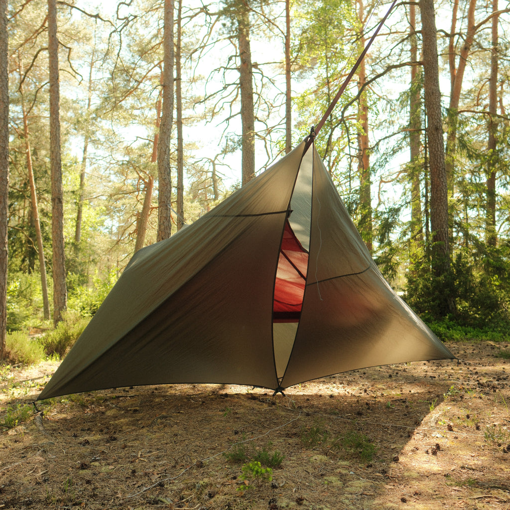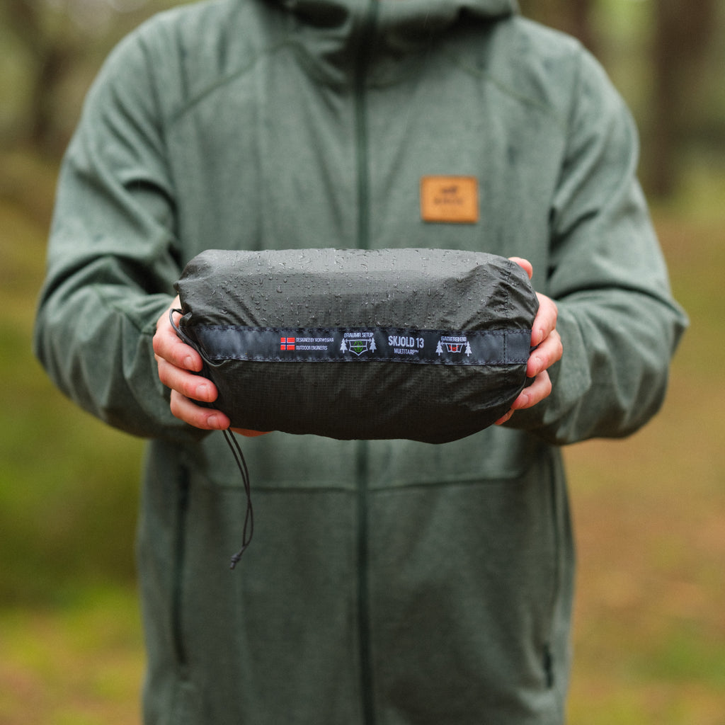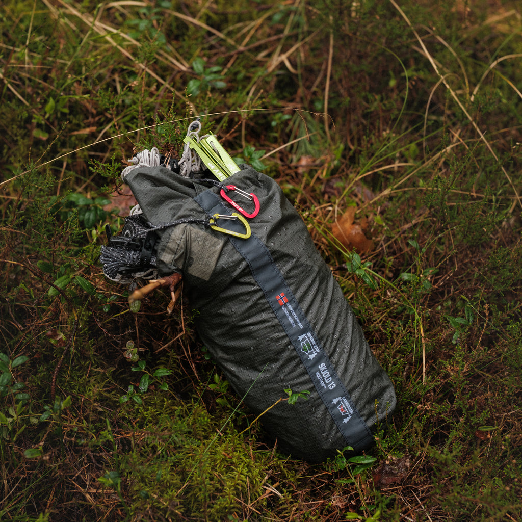 • Skjold 13 is ready to be deployed between two trees or set up using your trekking poles or sticks.